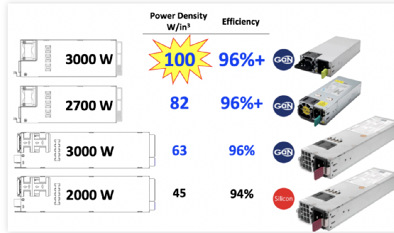 而在利用氮化镓这一技术后,其功率密度可以轻松达到100W/in3,能效达到95%以上。这样一来,数据中心可以在保证机架高度不变的情况下,用上更小的PSU电源模块,多出来的空间可以加装更多的DIMM内存,甚至是CPU。