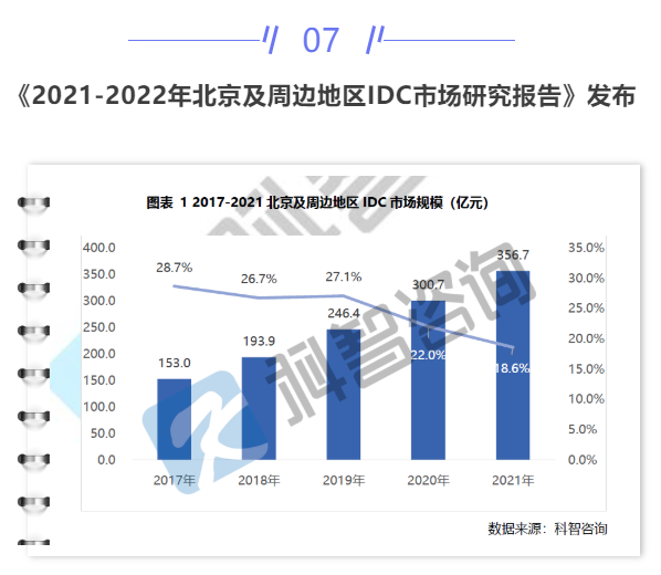 近日,科智咨询发布了《2021-2022年北京及周边地区IDC市场研究报告》。报告显示,2021年北京及环京周边地区传统IDC市场规模达到356.7亿元,同比增长18.6%,市场规模稳居全国首位。